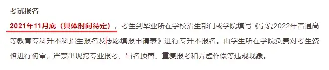 此前宁夏院校公布的招生简章中提到11月底开始报名,预计宁夏的政策可能会在11月发布。建议大家本月开始关注宁夏专升本的相关通知,一定不要错过报名。